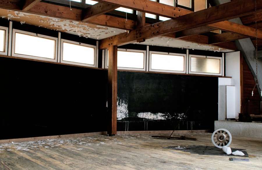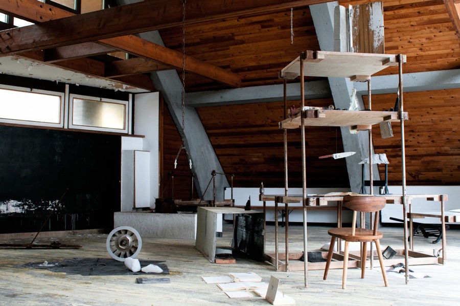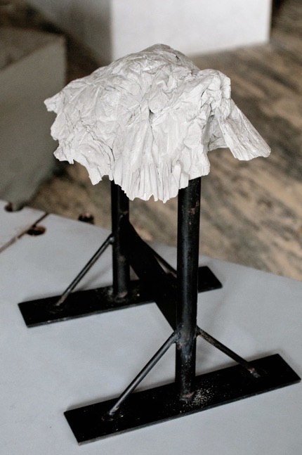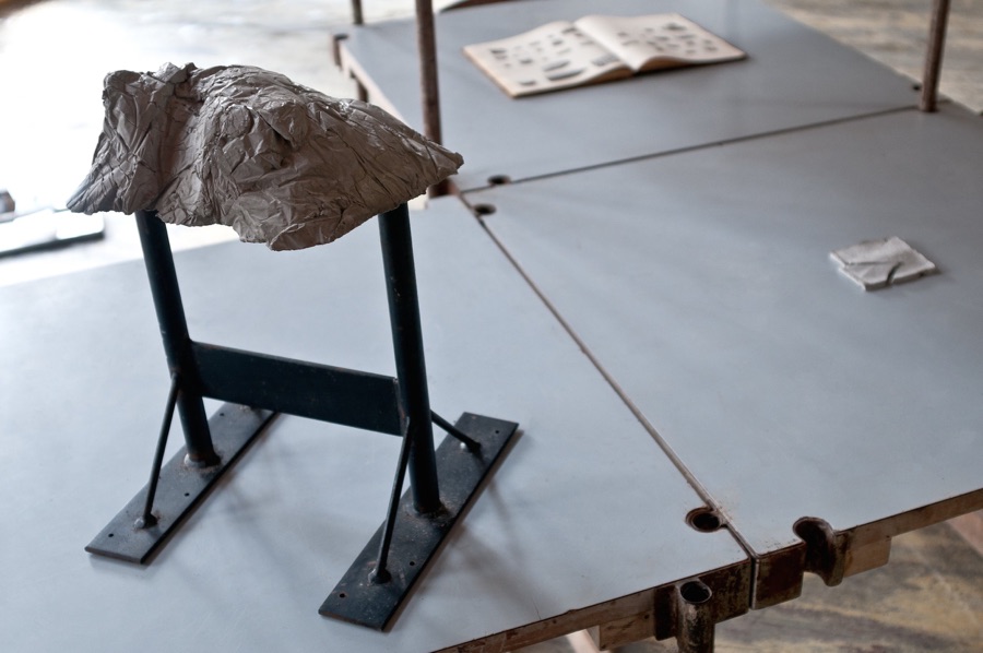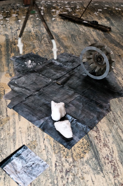 Object trouvé from the colony of the Village ENI (around 1950), sculptures in concrete tables, children's chair, geografiche maps (around year 1900), varnish black pigment, paraffin wax, oiled paper, ink