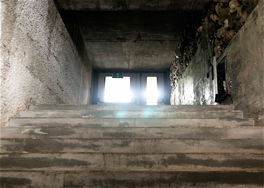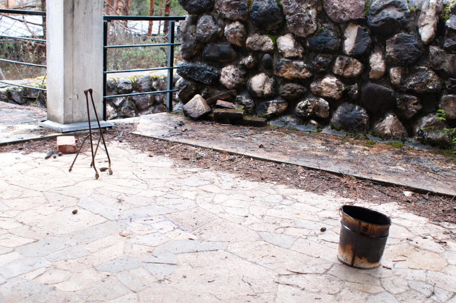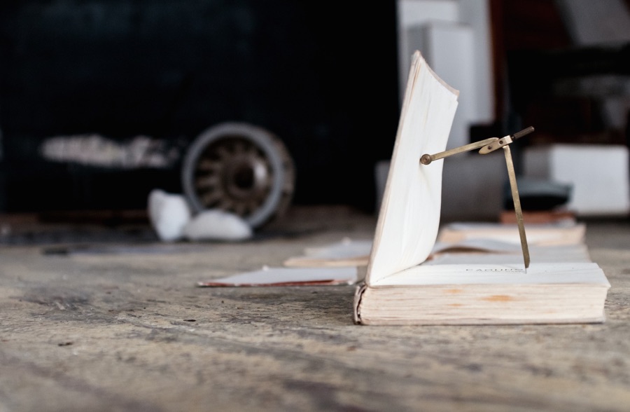 Wheel rope pulley, small metal door (object Village ENI,around year 1950), wooden die, concrete, polystyrene