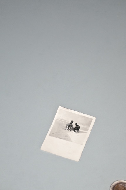 Metal stand, height 40 cm and table (object Village ENI,around year 1950), black and white photography (around year 1900), concrete