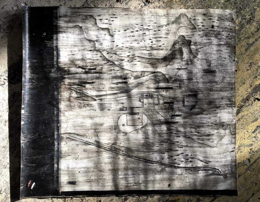 Maps photocopied (around year 1900), metal object (object Village ENI, around year 1950), salt, anti-fog nitro solvent, ink, varnish (original Village ENI))