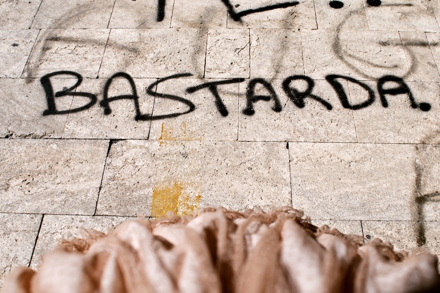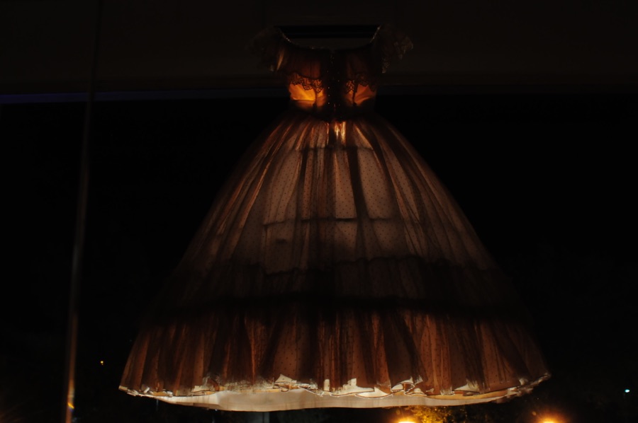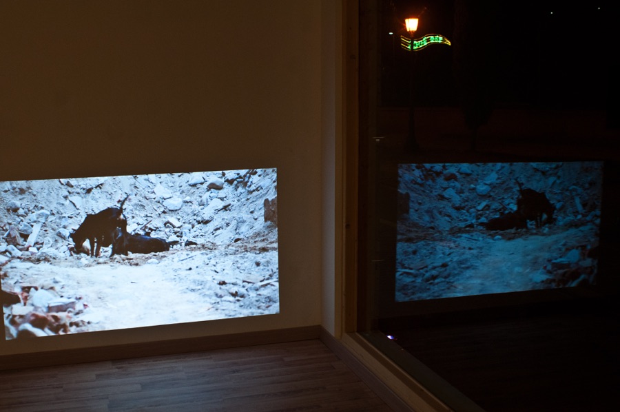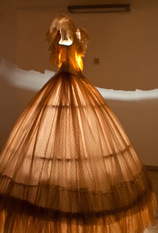 The installation „Truemmerfrauen - Even Wild Dogs Dance“ was made during the residency „BoCsArt“ (curated by Alberto Dambruoso, Cultural Association "I Martedi Critici“ in collaboration with the municipality and the province of Cosenza) in the Italian city Cosenza. It has two main parts: In the ground floor a video which starts with the image of three wild dogs playing easily in unrecognizable hard dirt. After a bit the video frame opens up and slowly one can identify that they are playing in a ruin of a broken down historic palace. In the upper floor a ballroom dress from the year 1834, installed, hanging on thin yarns, flying ghostly, lightened from below. Beside the dress a small Polaroid of the historical palace hangs on the wall. On the stair, which leads to the dress, there are installed little objects, photography’s of someone wearing the dress, a abandoned dog staring at the public, a stone sculpture of a strange animal, the hair of the princess and the little sleeves of the dress. A image about appearance and the inner state of the reality we see. A work about nostalgia and it‘s aftermath. About dreams and their fortune when they are not looked after enough.