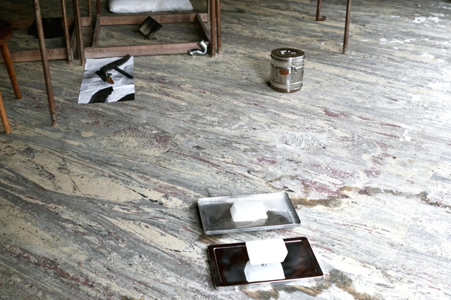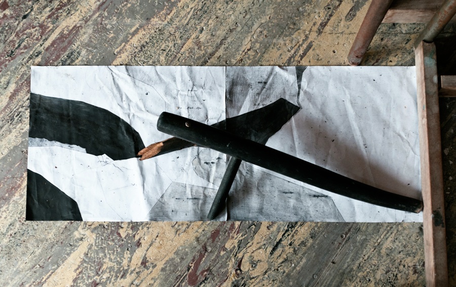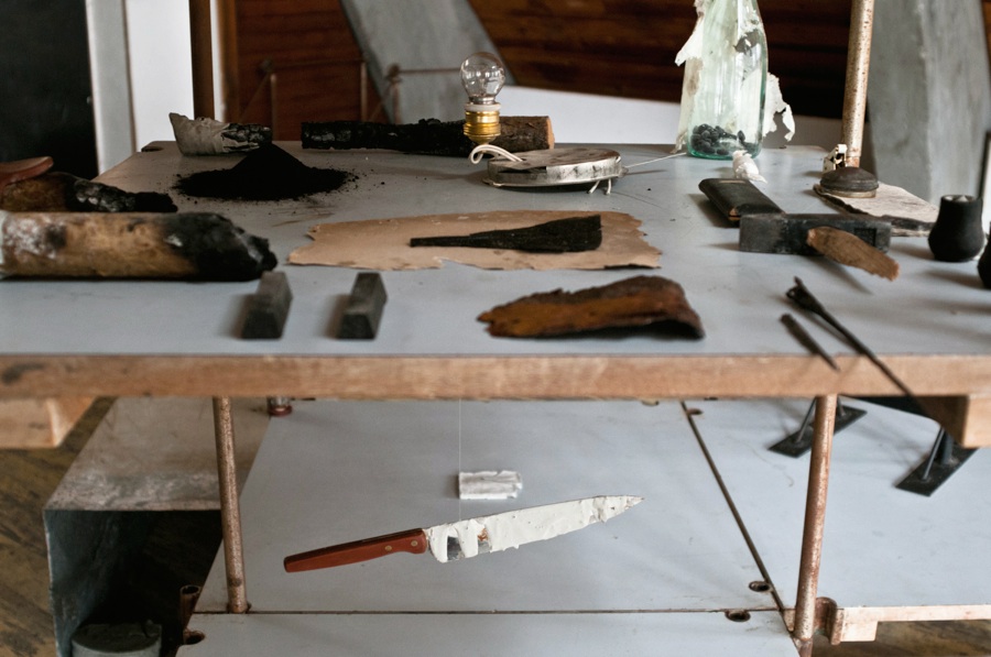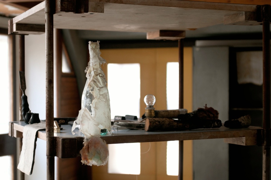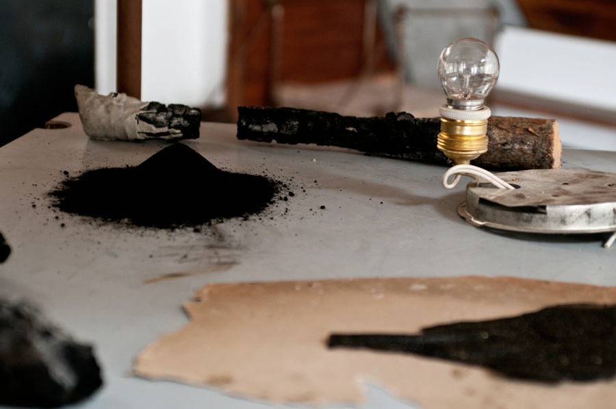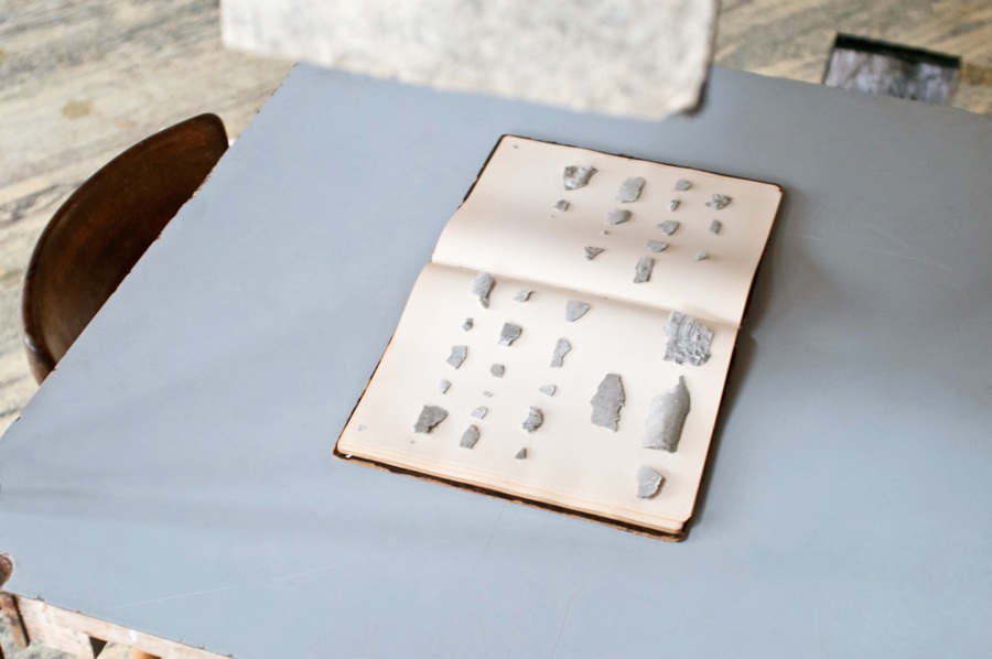 Object trouvé from the colony of the Village ENI (around 1950), sculptures in concrete tables, children's chair, geografiche maps (around year 1900), varnish black pigment, paraffin wax, oiled paper, ink