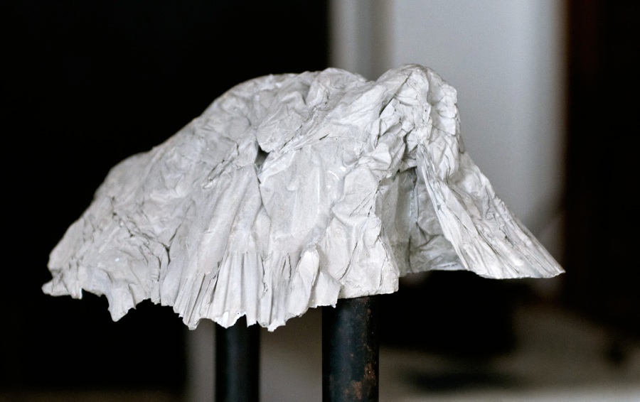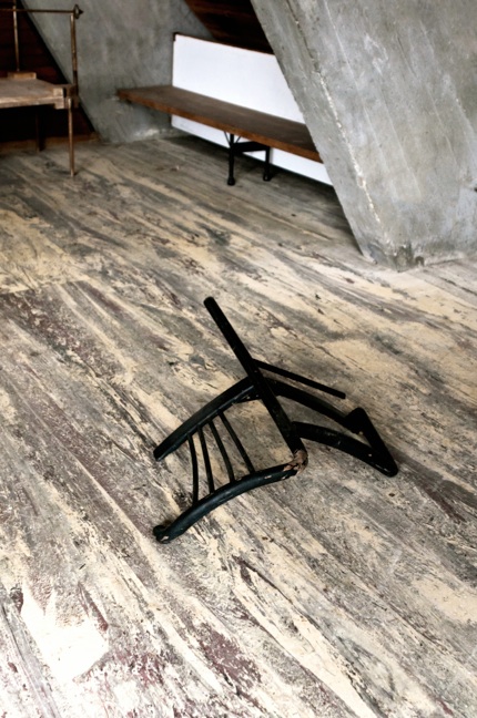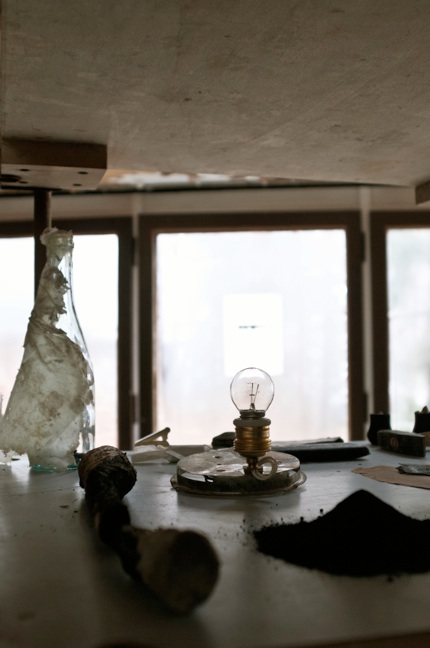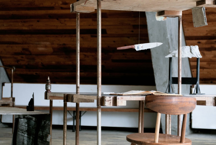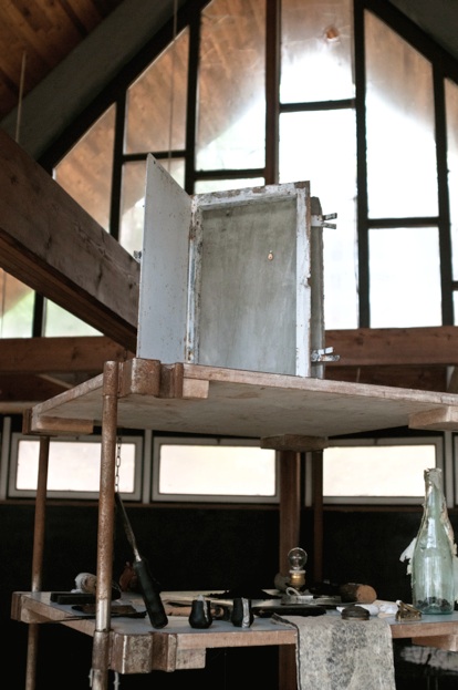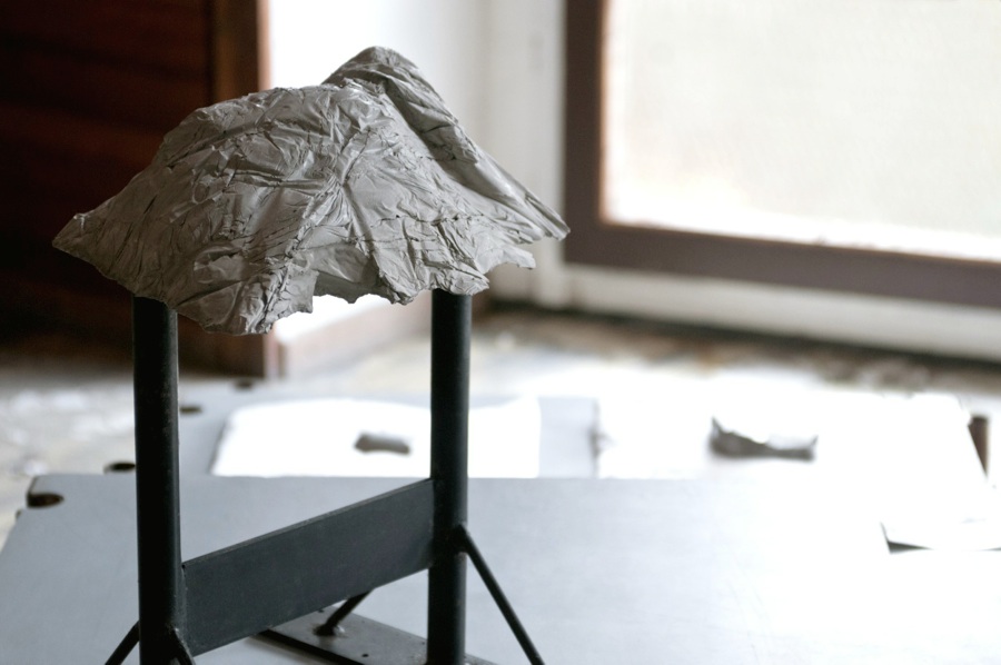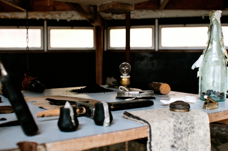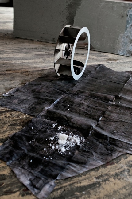 Object trouvé from the colony of the Village ENI (around 1950), sculptures in concrete tables, children's chair, geografiche maps (around year 1900), varnish black pigment, paraffin wax, oiled paper, ink