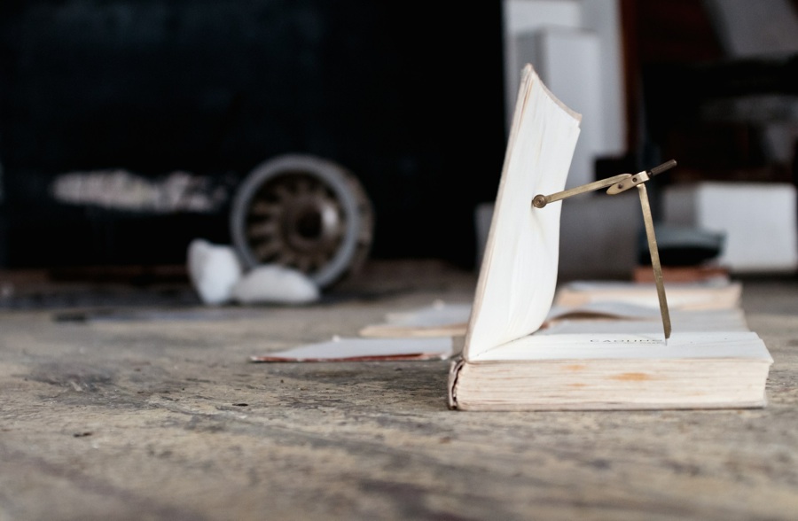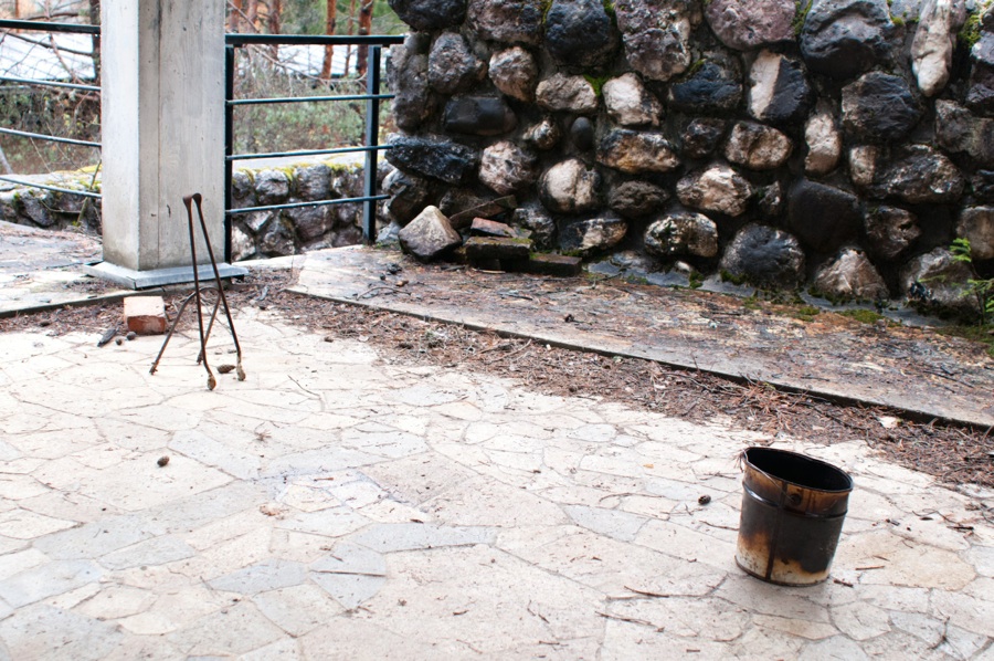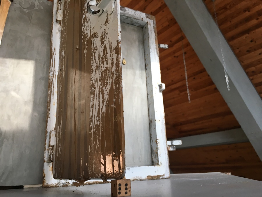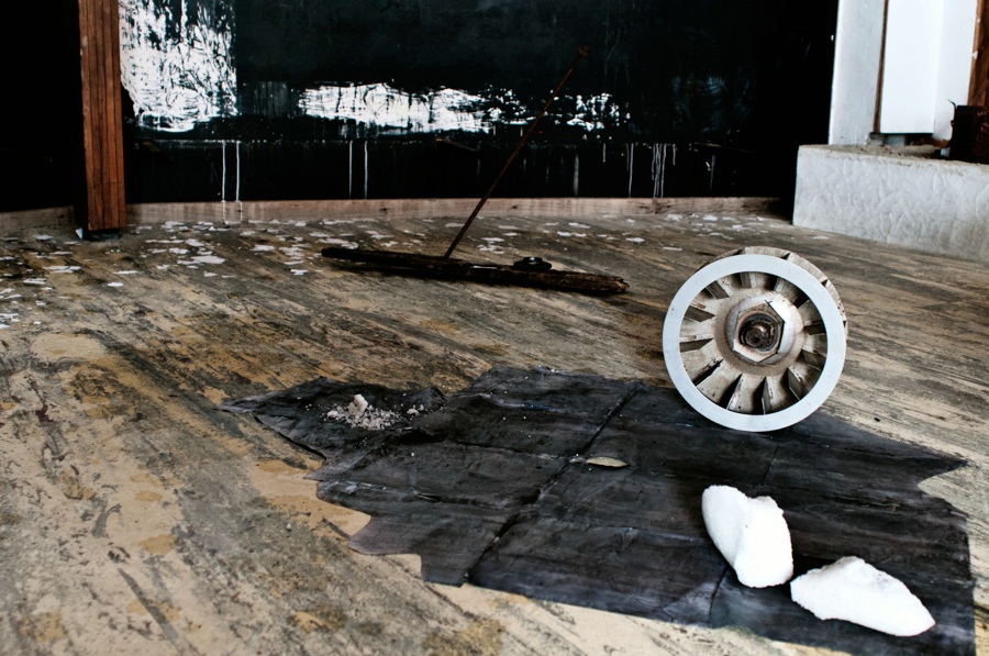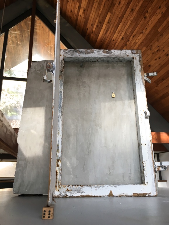 Wheel rope pulley, small metal door (object Village ENI,around year 1950), wooden die, concrete, polystyrene
