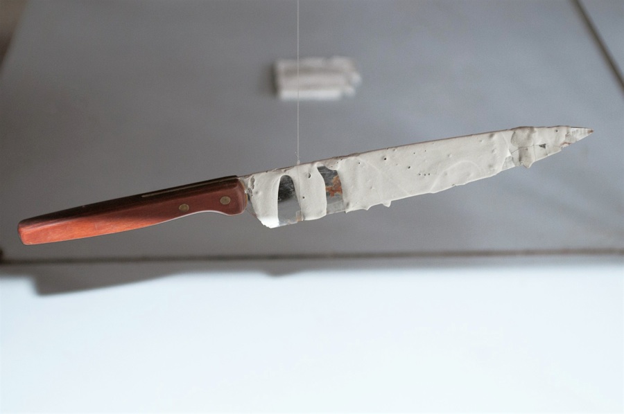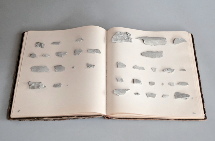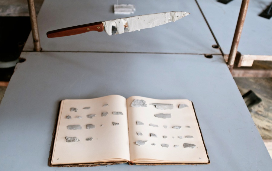 Knife, children’s chair and tables ((objects Village ENI),around 1950), family guestbook from the artist 26,5 x 21,5 cm, concrete