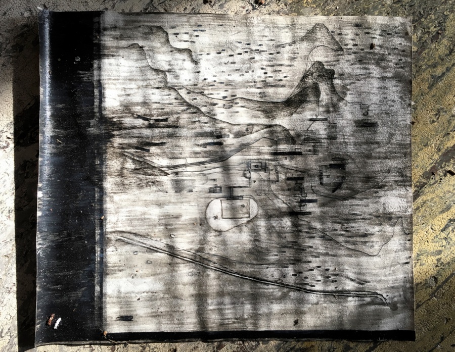 Maps photocopied (around year 1900), metal object (object Village ENI, around year 1950), salt, anti-fog nitro solvent, ink, varnish (original Village ENI))
