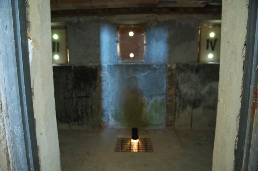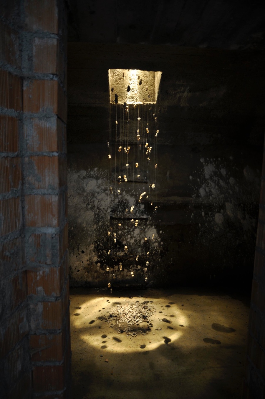 They are small children’s dolls with individual facial expressions and characters. The installation expanded over two adjunct stories. On the upper room the children’s heads are hidden from the observer behind a wooden board and are only visible through a hole in theboard that measures circa 10 cm in diameter. In the floor there is an opening of 40 x 40 cm to the room underneath. This opening is barred like a prison window, and through it a flashlightilluminates the lower room. The partially broken bodies of the dolls hang from the bars on threads. Down on the ground lay the arms and legs of the children, recognizable only asmountain of indistinct pieces.